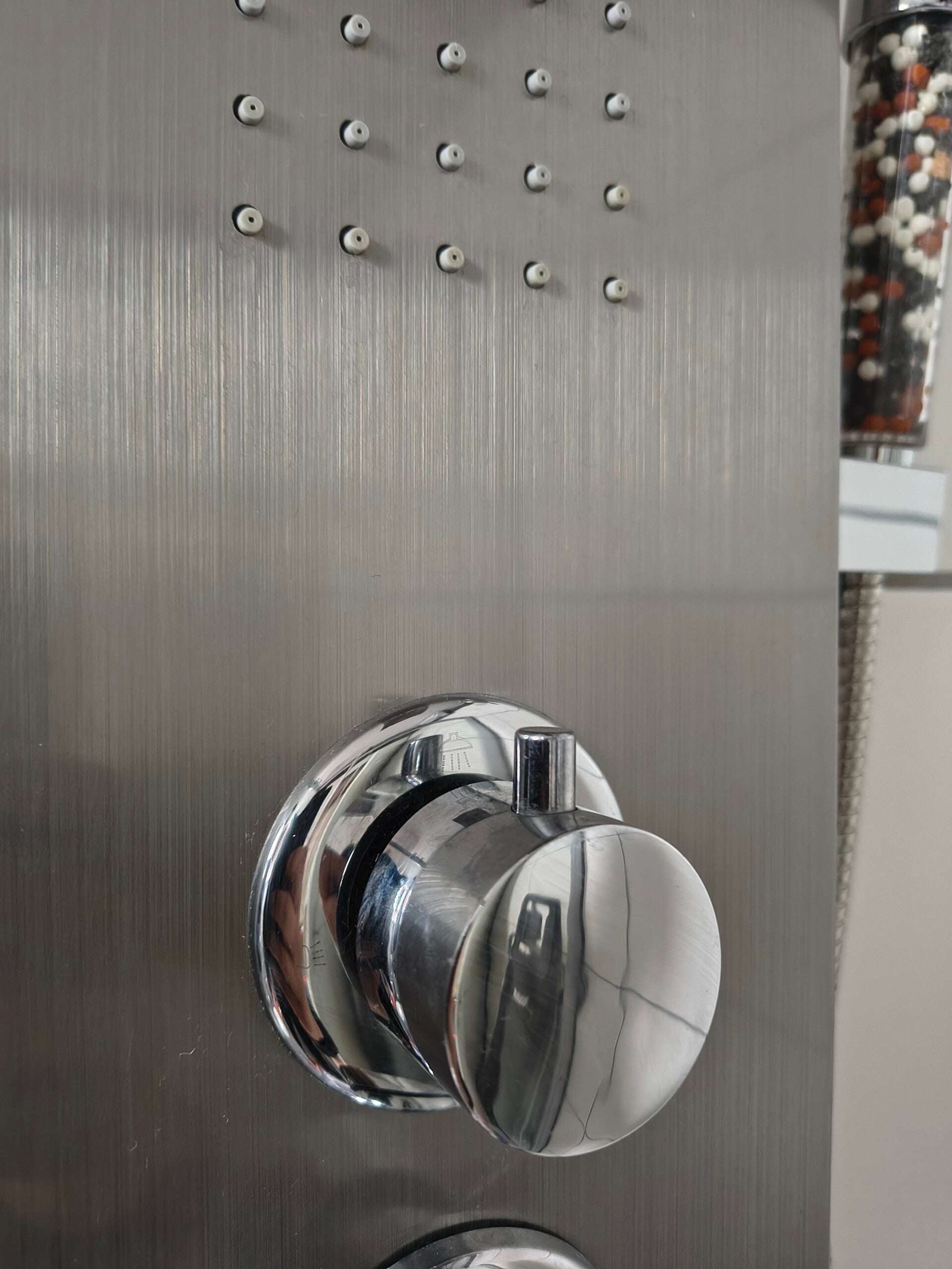 Bei der Dusche handelt es sich um eine Multifunktionsdusche mit mehreren Düsenfunktionen. Der untere Wahlhebel ist für die Einstellung des Wasserstrahls und die Temperatur zuständig.